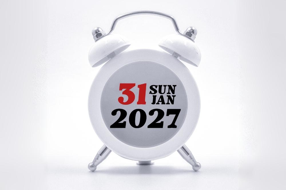 PSTN shutdown, White alarm clock displaying 31 Sun Jan 2027 on its face, symbolising the UK PSTN shutdown deadline.